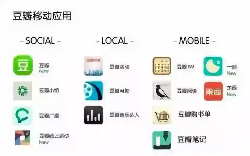 △历史上的豆瓣系App们。从2014年开始,它们都汇成了一个豆,就是排第一的那个绿色App:“豆瓣”(图源:科技新观察)。遍地开花做App的策略,后来被证明是失败的。