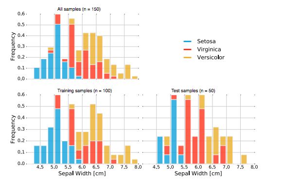 鸢尾花的随机抽取的训练集和测试设置的分布