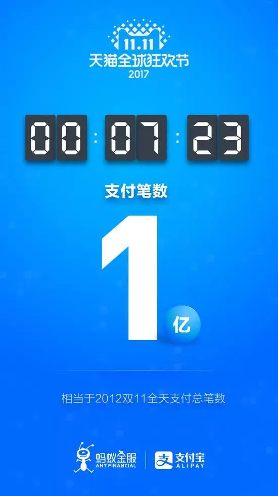 7分23秒支付笔数突破1亿笔,支付峰值达25.6万笔每秒
