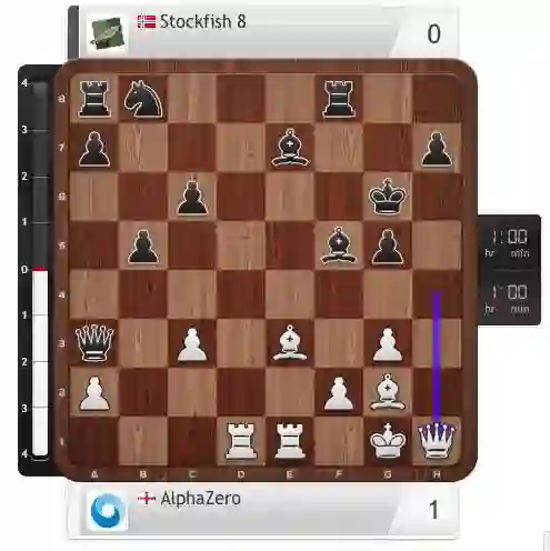AlphaZero 和 Stockfish 的比赛。最后一手:26. Qh1!象棋特级大师 Francisco Vallejo Pons 称这场比赛像「科幻小说」。图片来源:chess24