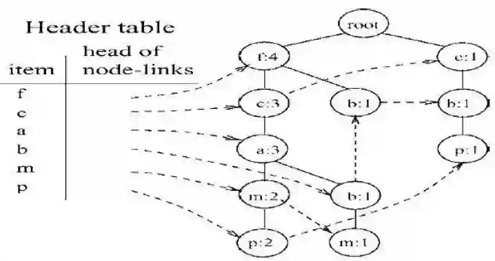 FP Growth是一种比Apriori更高效的频繁项挖掘方法,它只需要扫描项目表2次。其中第1次扫描获得当个项目的频率,去掉不符合支持度要求的项,并对剩下的项排序。第2遍扫描是建立一颗FP-Tree(frequent-patten tree)。