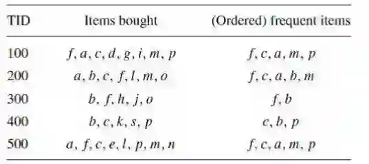 接下来的工作就是在FP-Tree上进行挖掘,比如说有下表: