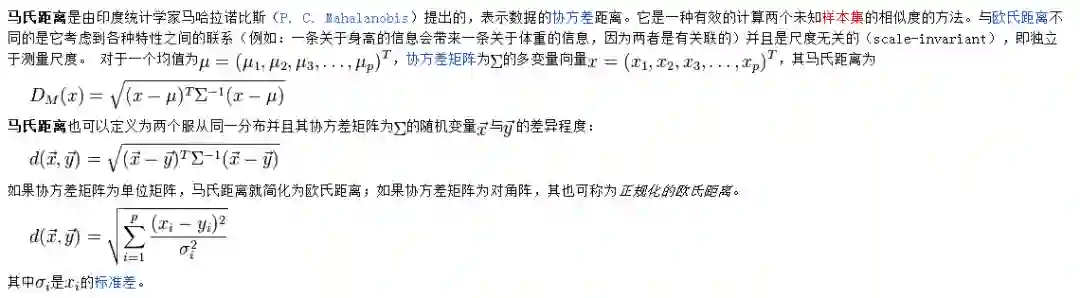 注:马氏距离一定要先给出样本集的统计性质,比如均值向量,协方差矩阵等。关于马氏距离的介绍如下: