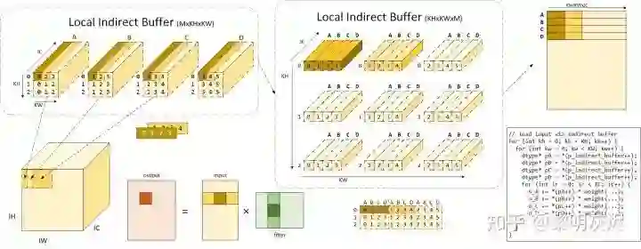 如相关章节的讨论,Im2col 优化算法存在两个问题,第一是占用大量的额外内存,第二是需要对输入进行额外的数据拷贝。这两点如何才能解决呢?间接卷积算法给出的答案是间接缓冲区(Indirect Buffer),如图五右半所示。