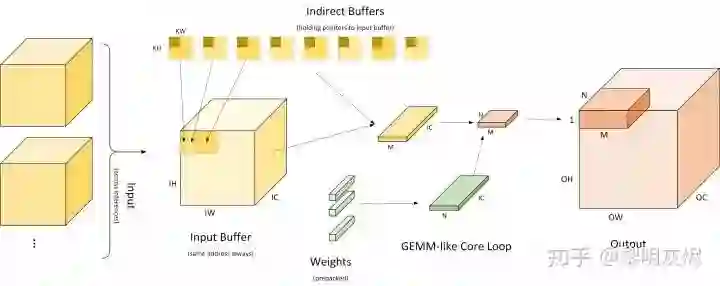图中将平面缓冲区绘制成三维形式(增加 IC 维度),意在说明间接缓冲区的每个指针可索引 IC 个输入元素,而每个间接缓冲区索引的内容即为与权重对应的输入内存区域。