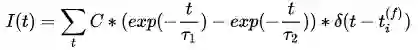利用L&F构成网络就涉及到如何在神经元之间传递脉冲信号,这就是突触电流的响应模型。常用的电流模型是一种基于指数衰减的模型(与膜电位的模型很相似),改进的模型可以是两个衰减模型的叠加,来模拟平滑的脉冲信号(代替阶跃函数表示的脉冲):