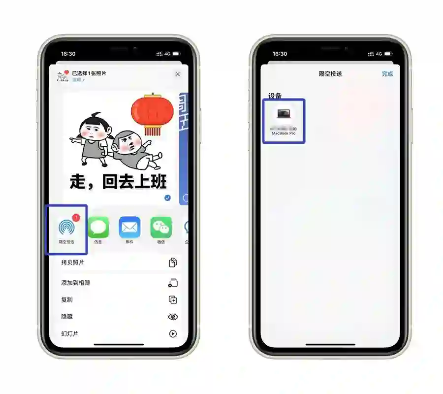 然后选择你要分享的内容例如图片,点击共享按钮,选择「隔空投送」,就能看到你想分享的设备,选择就好了,传输的速度也是非常的快。