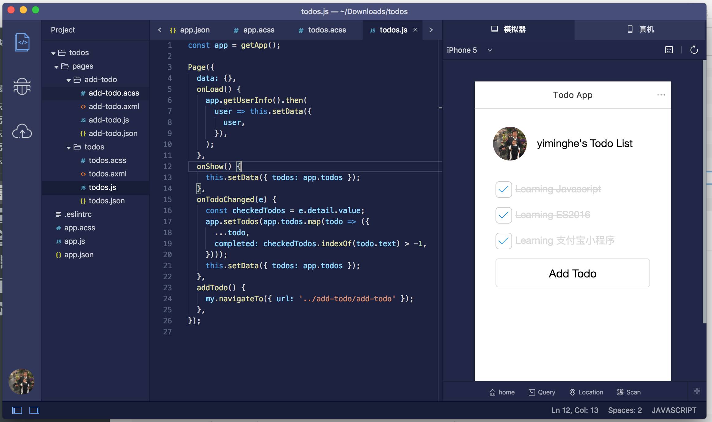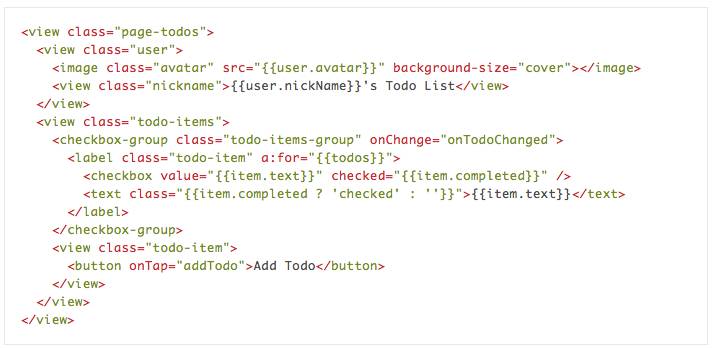 来搭建页面结构以及 a:for (https://docs.alipay.com/mini/framework/axml#列表渲染)绑定 todos 数据,并将 todos 数据循环展开节点。
