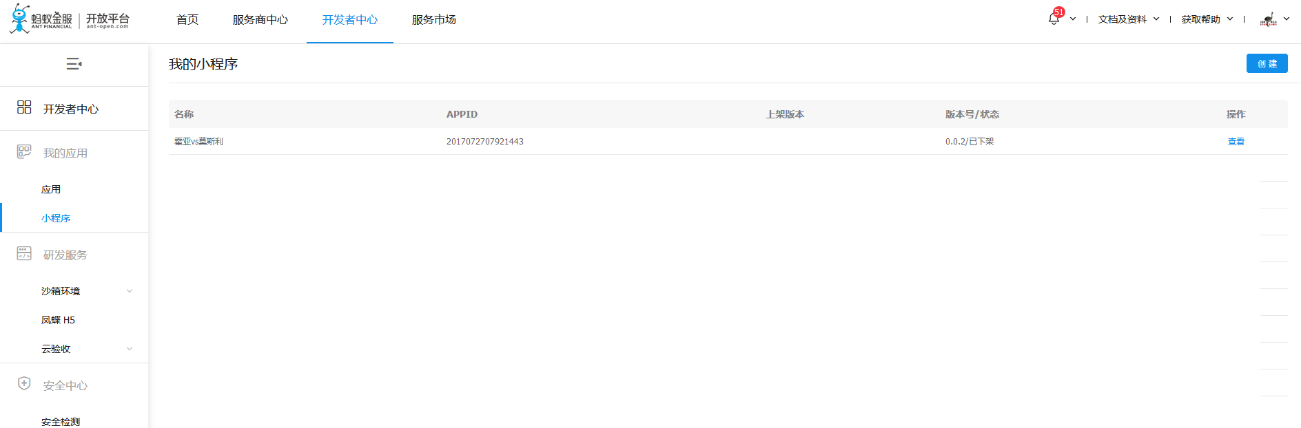 创建后可在【我的小程序】列表页看到对应的小程序APPID,该ID在上传版本时需要填写