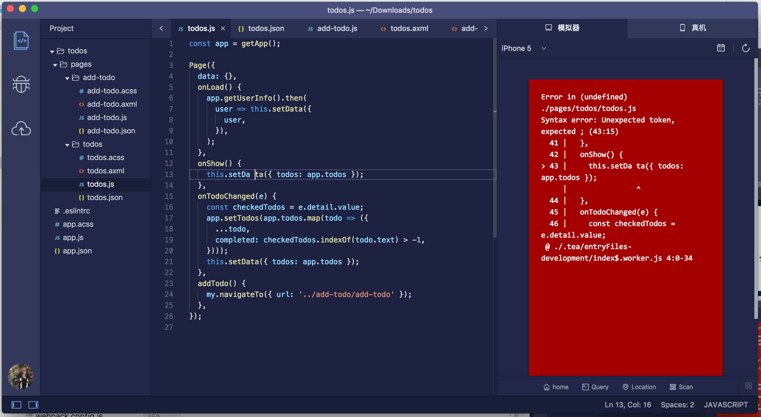 当开发者在 axml 或者配置文件里编译出错时,保存后会对错误的信息以 redbox 的形式呈现给开发者。