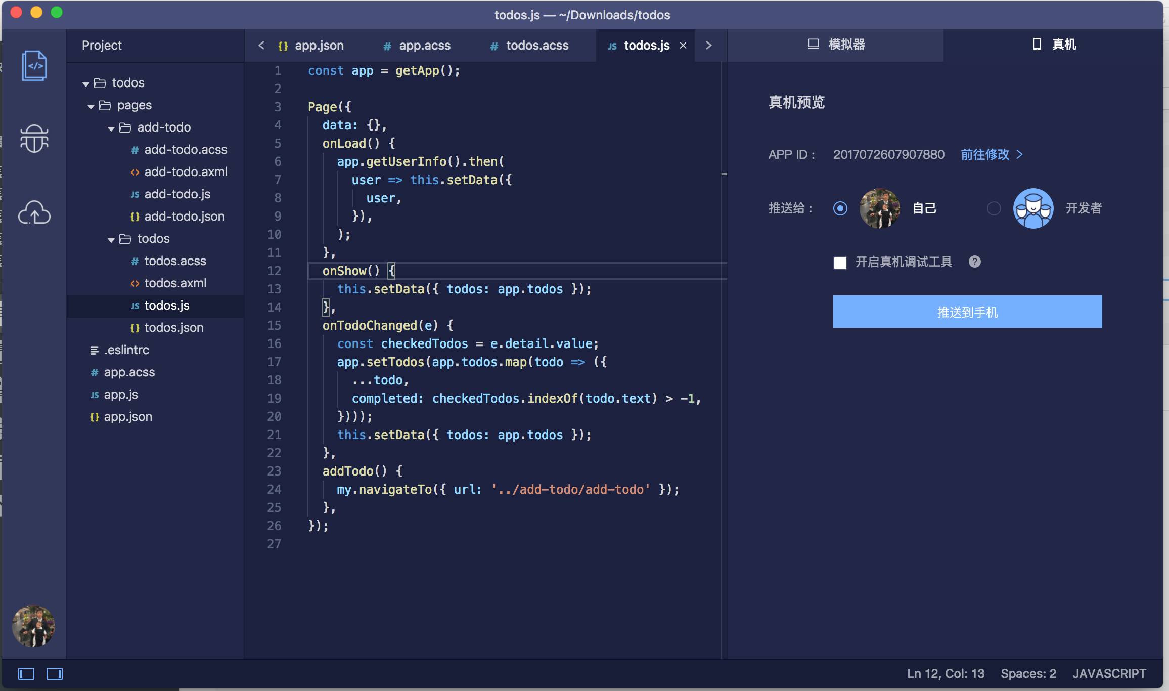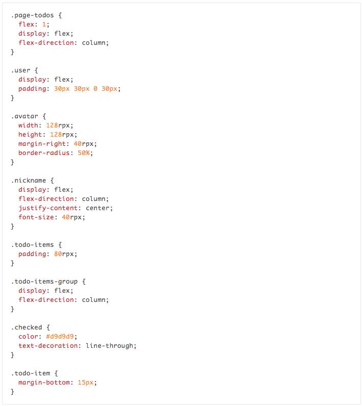 在这个示例中,我们有两个页面,Todo List 页面和 Add Todo 页面,他们都在 pages 目录下。小程序的所有页面路径必须写在 app.json 中,路径从项目根目录开始且不能包括后缀名,pages 的第一个页面就是小程序的首页。
