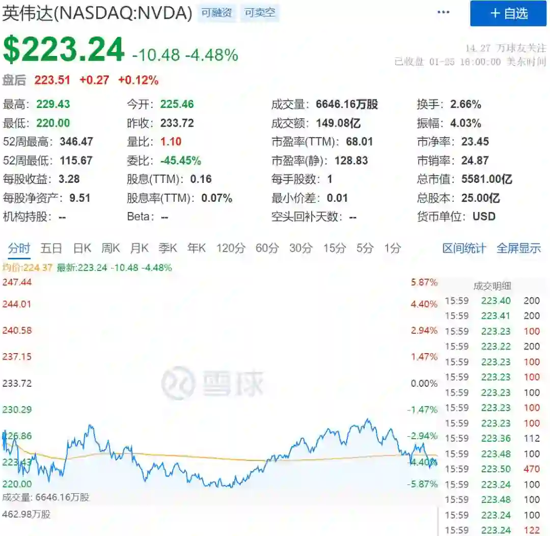 英伟达接近放弃收购 Arm 的新闻曝出后影响了投资者的心态,截至周二美股收盘,英伟达股价下跌 4.48% 至 223.24 美元。软银的美国存托股下跌了 4.9%。