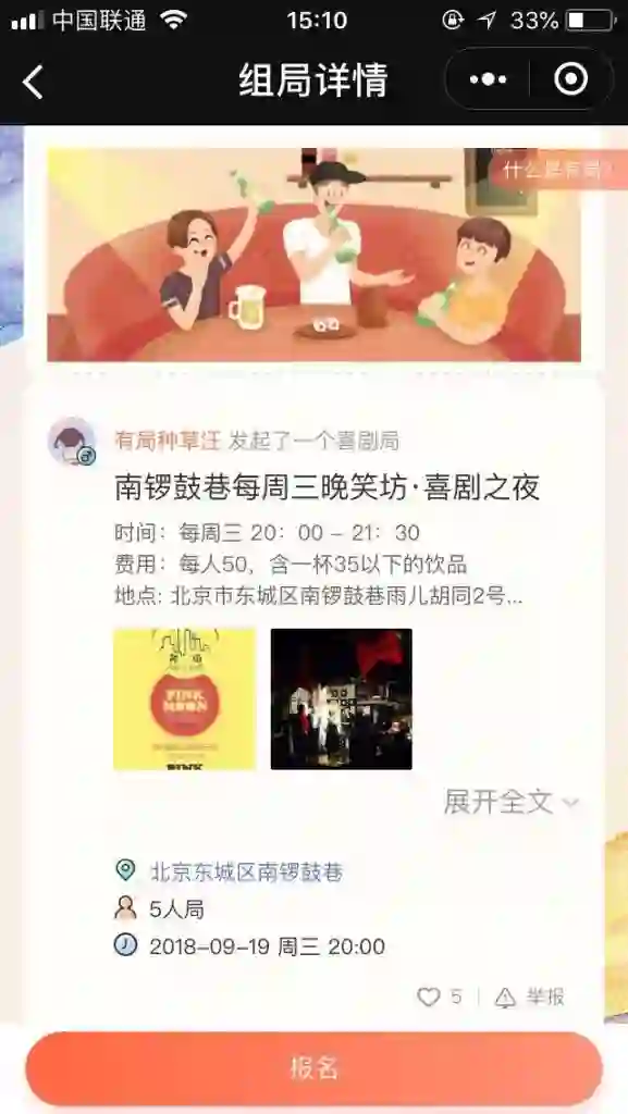顾名思义,它首先就是为了线下社交而存在的。很多时候,不知道假期去哪里的你可能更想去蹭一个局,这时你可以在「一起有局」的首页栏目中看到系统推荐的同城美食展览活动。「一起有局」的详情页会描述活动的具体人数、目的和具体费用,这样明码标价就避免了很多陌生人之间为买单的烦恼而闹不愉快的尴尬。当你对某个设局的活动有意向,点击报名届时就可以参与了。