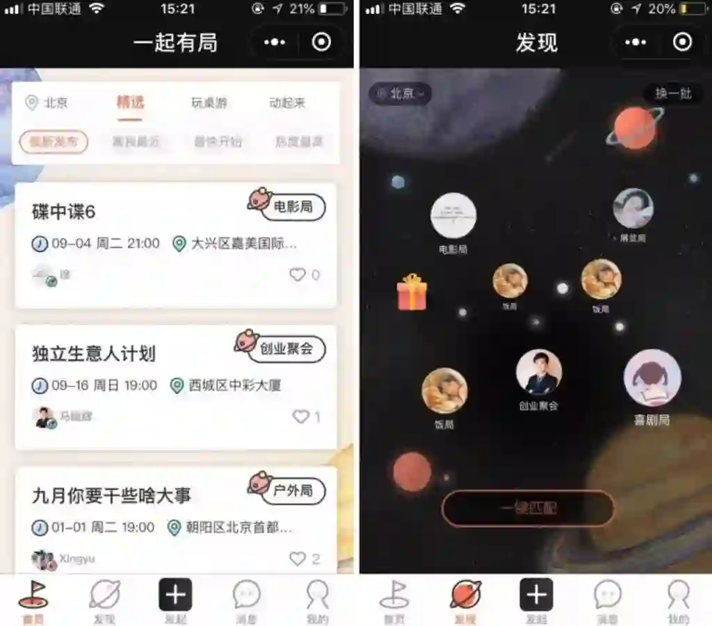 建议新来的朋友可以多在“首页”随便看看抢注自己感兴趣的某个局,或者在“发现”里根据标签随机匹配,发现自己感兴趣的局。值得一提的是,这个发现标签页做成了一个个星球的设计样式,似乎也有着连接无数平行宇宙以及无数可能性的涵义,对于独在异乡为异客的中国亿万年轻人来说,这样子找到志同道合的朋友也算是一种不错的慰藉。