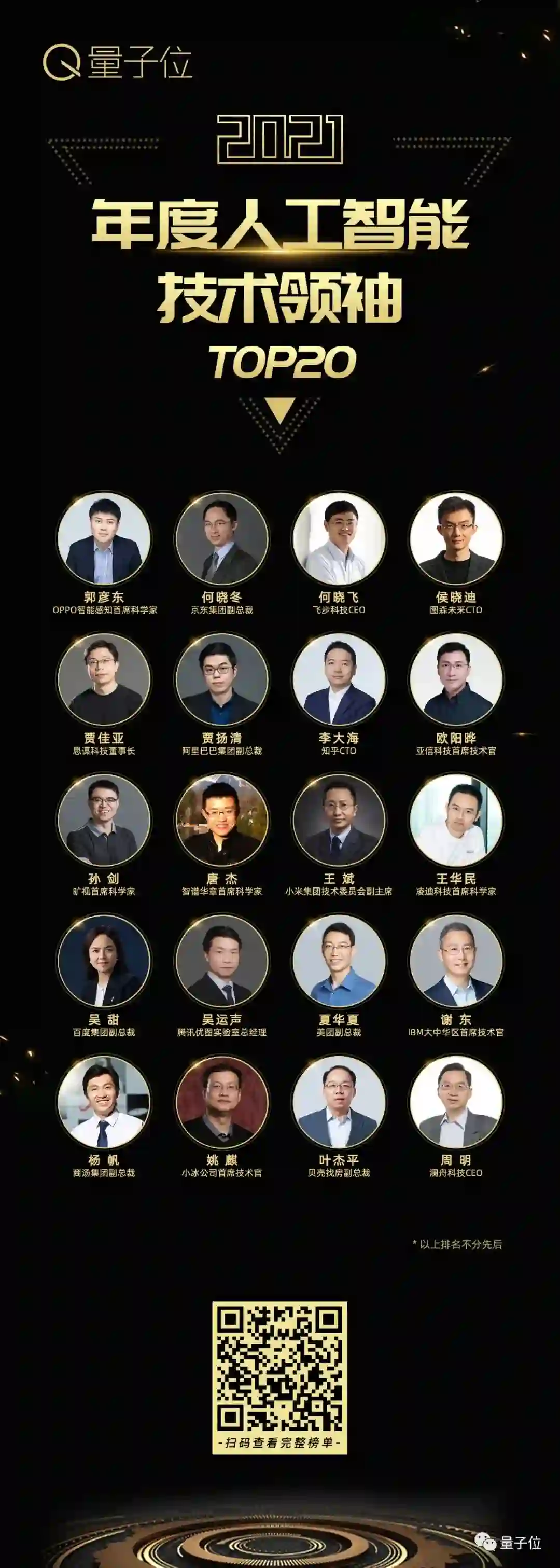 「2021年度人工智能技术领袖TOP20」评出的是在学界振臂一呼、跟随者众的杰出科学家,他们如今亦在AI商业化的前进道路上再次自我证明。在AI工业界光环闪耀的一个个坐标之下,他们的技术判断力、学术影响力正在不断转化成推动创新的动能。