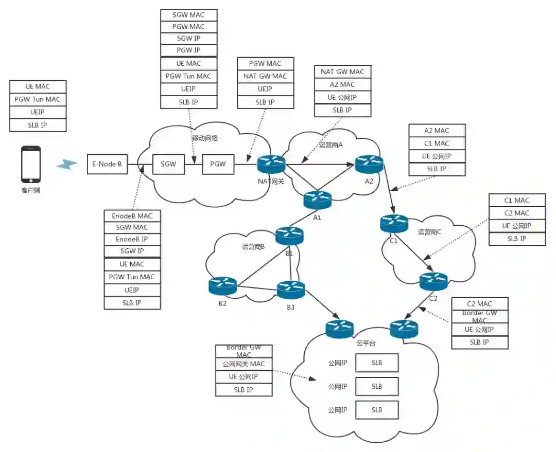 到达A2之后,从路由表中找到下一跳是路由器C1,于是将目标MAC换成C1的MAC地址。到达C1之后,找到下一跳是C2,将目标MAC地址设置为C2的MAC。到达C2后,找到下一跳是云平台的边界路由器,于是将目标MAC设置为边界路由器的MAC地址。