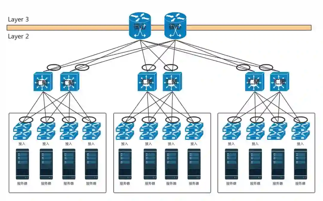 多个接入层神仙被一组汇聚层神仙(汇聚层交换机)管着,多个汇聚层的神仙被一组核心层神仙(核心交换机)管着。