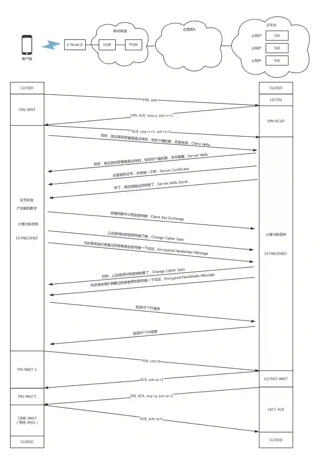 HTTPS协议是基于TCP协议的,因而要先建立TCP的连接。在这个例子中,TCP的连接是从手机上的App和负载均衡器SLB之间的。也就是唐僧和金顶大仙之间,到了金顶大仙,就不怕了,会指引到佛祖那里的。