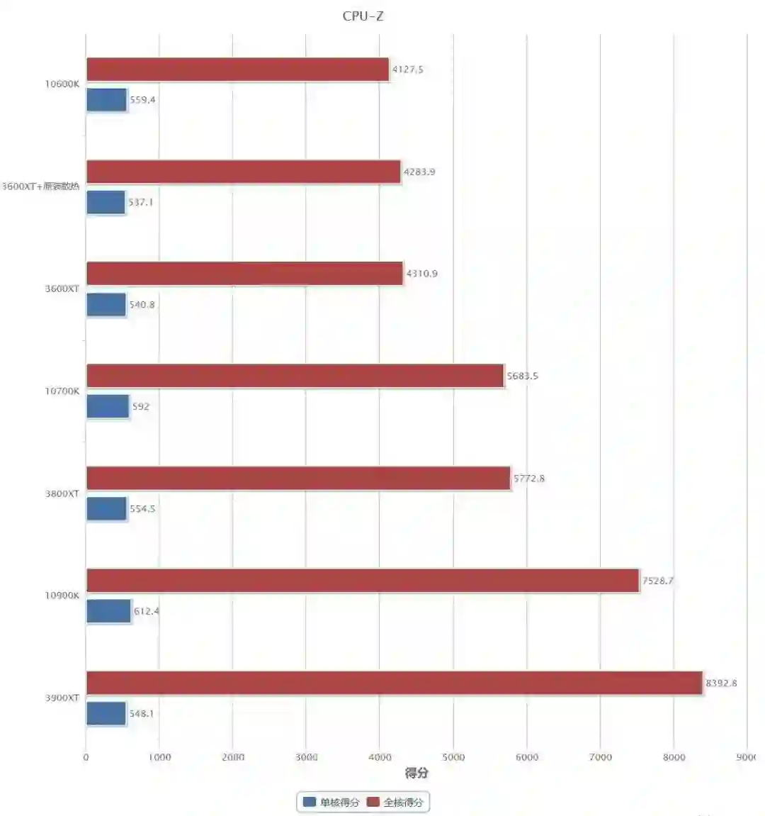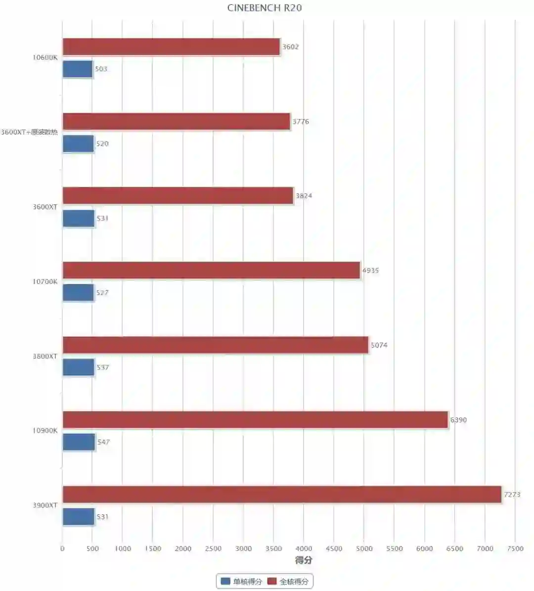 负载更高的Cinebench R20测试中,三代锐龙的单核效能会更高一些,但10900K的5.3G加速也不容小觑,3900XT在全核性能测试中领先10900K约13.8%。