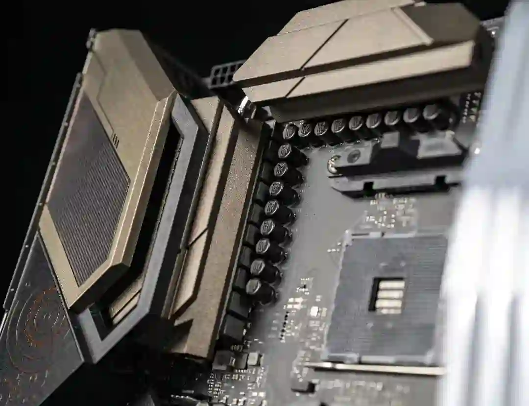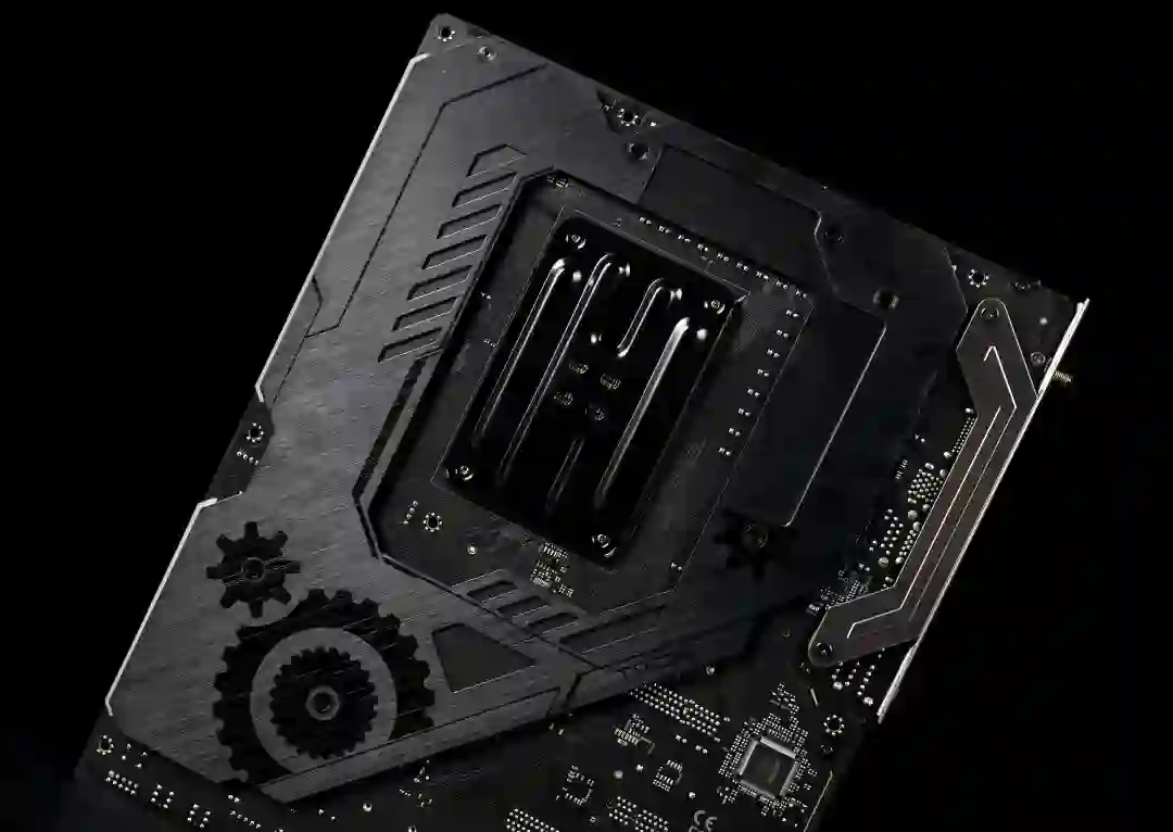 供电散热盔甲也做了强化,太极LOGO在未开机时是隐藏在斜条纹的装饰板背后,一眼望去能看到密密麻麻的供电元件以及双8Pin的供电接口。