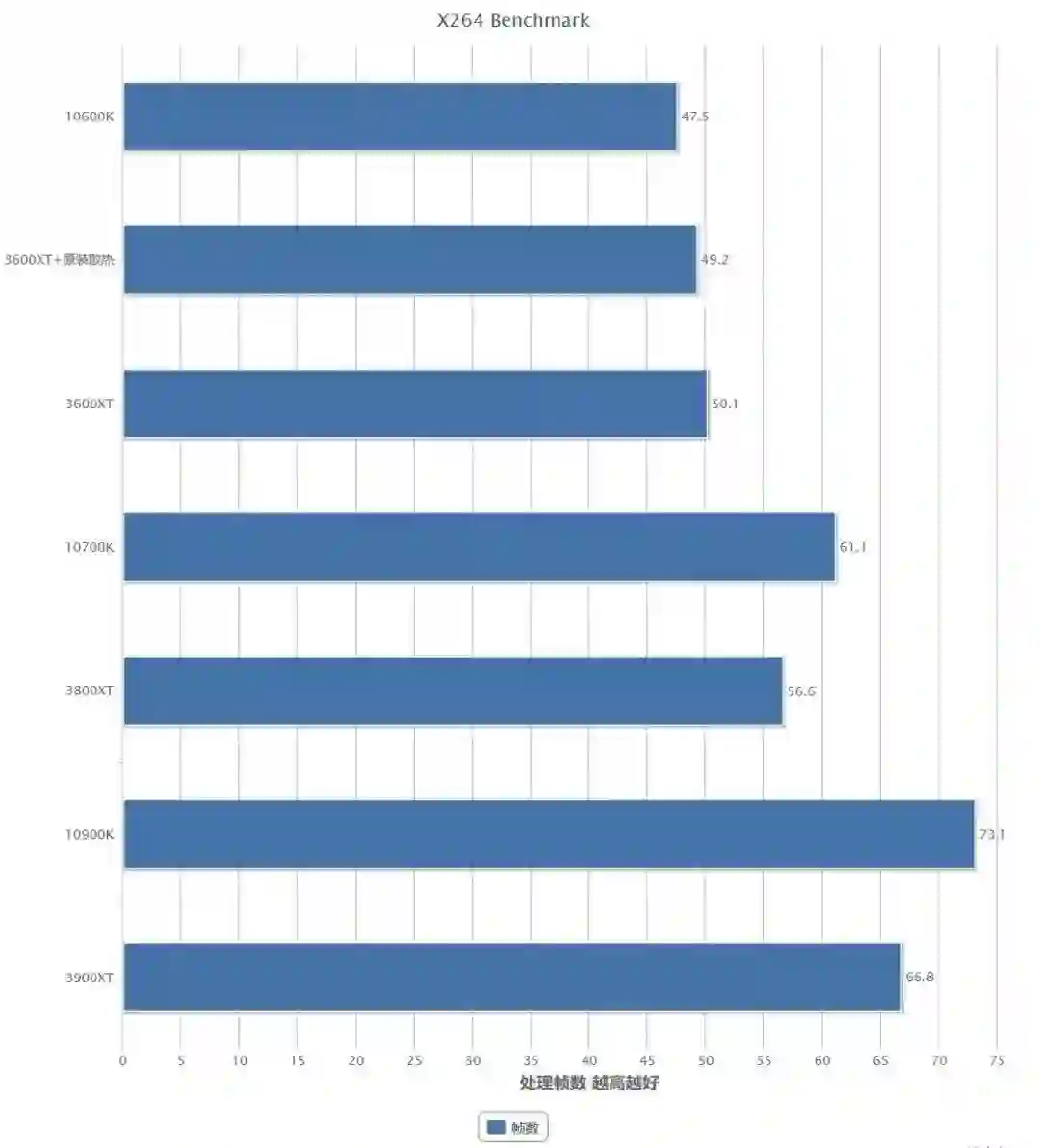 在264视频转码测试中结果也雷同,可能与软件优化有关