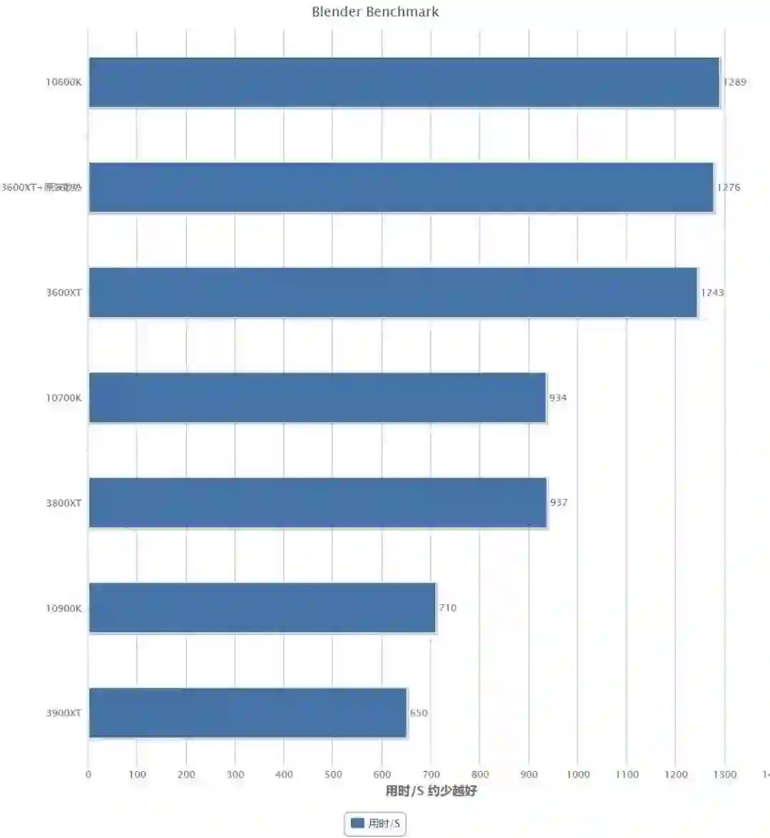 多功能三维软件Blender基准测试,3900XT相比渲染用时最久的10600K节省了约一倍时间。
