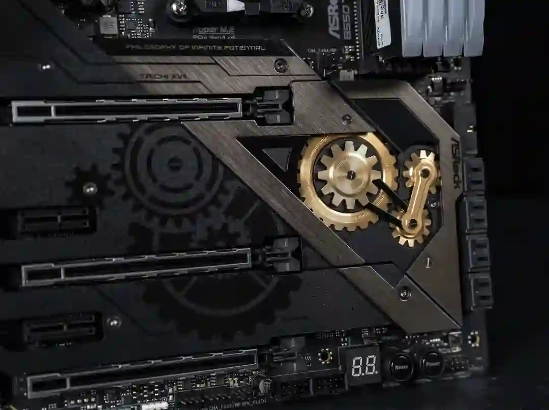 这次测试的3600XT和3800XT使用的是华擎B550的旗舰太极,比起X570,B550上的太极标志性金色齿轮更加突出,M.2固态硬盘安装方式也更加便捷了,快捷开机、重启键、Debug灯,Type-C接口也同样没落下。
