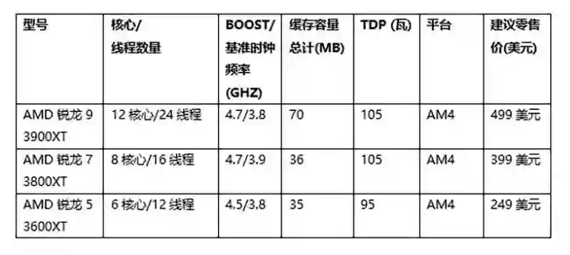 AMD锐龙5 3600XT、 AMD锐龙7 3800XT、AMD锐龙9 3900XT