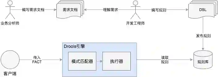 目前最流行的规则引擎应该是Drools, 用 Java 语言编写的开放源码规则引擎,使用 Rete 算法对所编写的规则求值,其操作流程如下: