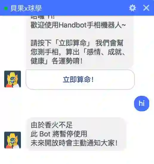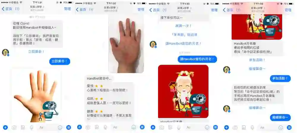 近日,台湾大学举办的一场黑客马拉松(黑客松)比赛上。一位名叫Claire Ching Chen的大学生与实习的同事、大学朋友以及brother 联手开发了一个用于看手相的聊天机器人,名叫Handbot,可通过Facebook Messenger调用。