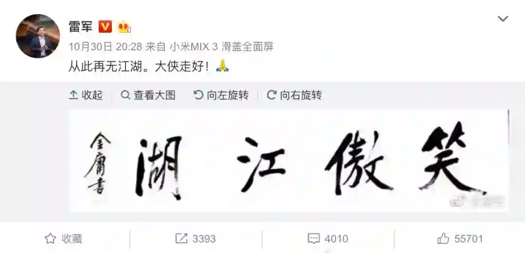 10月30日晚,雷军分享金庸的书法作品“笑傲江湖”,并配文“从此再无江湖。大侠走好!”,以此来悼念金庸。