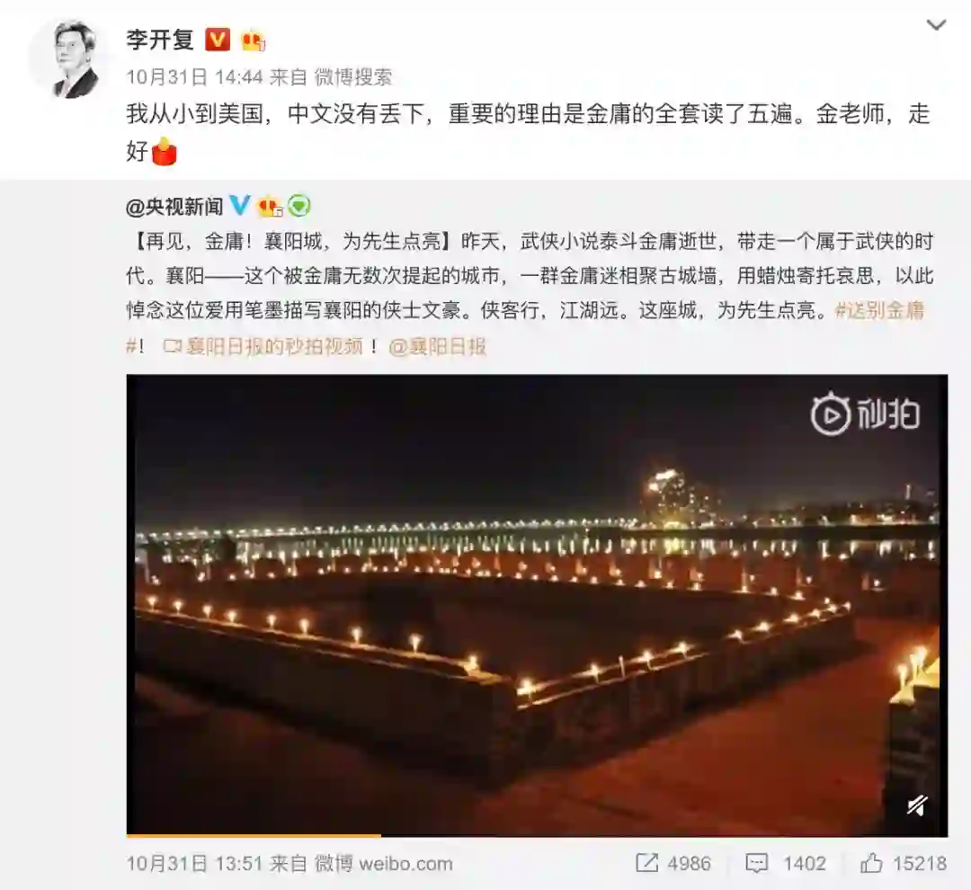 10月31日下午,李开复转发央视新闻【再见,金庸!襄阳城,为先生点亮】的视频微博,并配文称“我从小到美国,中文没有丢下,重要的理由是金庸的全套读了五遍。金老师,走好”。