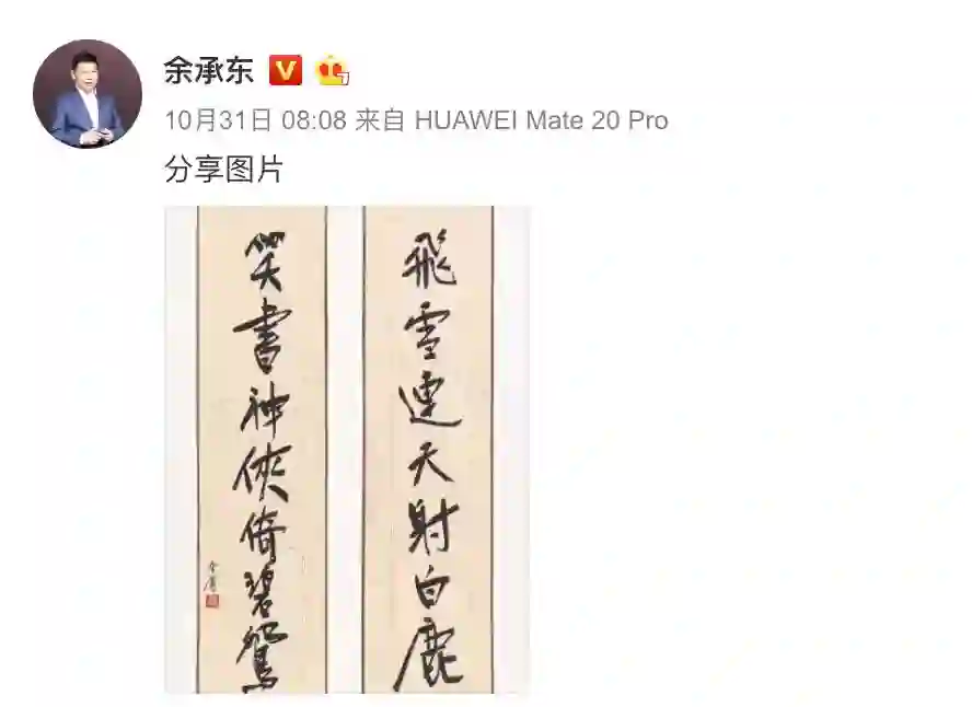 10月31日上午8:08,余承东在微博分享了一张书有“飞雪连天射白鹿,笑书神侠倚碧鸳”对联的图片,无言中以金庸的十四部作品表示缅怀。