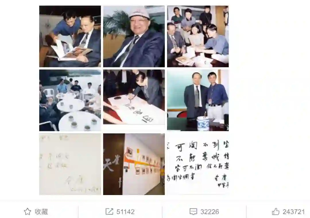 10月31日,马云在非洲发布微博长文悼念金庸。他写道:“初见先生,我如话痨,一人絮叨三小时,先生只笑着听,此情此景,如在眼前;此情此景,再难重现!”马云称如果没有金庸,今天的阿里一定不会是今天这样几万人一起痴痴颠颠,“创业,便要做别人做不得之事,侠之大者,为国为民;做人,便要至情至性笑傲江湖;朋友,便要肝胆相照至死不渝……”马云还分享了与金庸先生珍贵的合照。