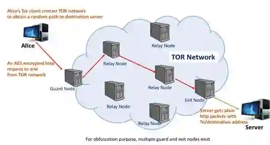 图3:Alice与目标服务器之间TOR通信的说明。通信开始于Alice向服务器请求一个地址。TOR网络给出AES加密的路径。路径的随机化发生在TOR网络内部。包的加密路径用红色显示。当到达TOR网络的出口节点时,将简单分组转发给服务器。出口节点是TOR网络的外围节点。