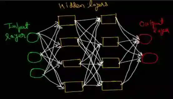 可以使用神经元层来构建神经网络。网络需要实现的目标不同,其架构也是不同的。常见的网络架构是前馈神经网络(Feed ForWard Neural Network,FFN)。神经元在无环的情况下线性排列,形成FFN。因为信息在网络内部向前传播,它被称为前馈。信息首先经过输入神经元层,然后经过隐藏神经元层和输出神经元层(图2)。