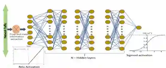 请注意,源IP/端口、目标IP/端口和协议字段已经从实例中删除,因为它们会导致模型过拟合。我们使用具有N隐藏层的深度前馈神经网络来处理其他所有特征。神经网络的架构如图5所示。