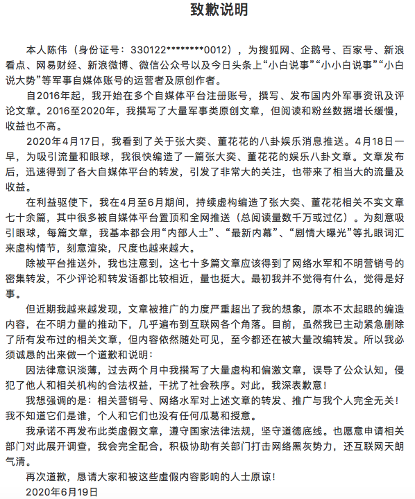 微信公众号“小白天下”持有者陈某通过其个人自媒体渠道刊登一篇《致歉说明》,承认为吸引流量和眼球,在利益驱动下,围绕“阿里蒋凡事件”在两个月内编造了70余篇黑稿全网推送,阅读量过亿。并称幕后另有黑手,自己遭受利用。“我正式道歉,请大家原谅!”陈某表示,其在诸多平台拥有“小白说事”、“小小白说事”、“小白看大势”等多个账号。“蒋凡事件”发生后,其通过上述账号持续编造了70余篇内容,总阅读量过亿。不仅得到各平台的高频全网推送,更遭到不明网络势力的猛烈传播。