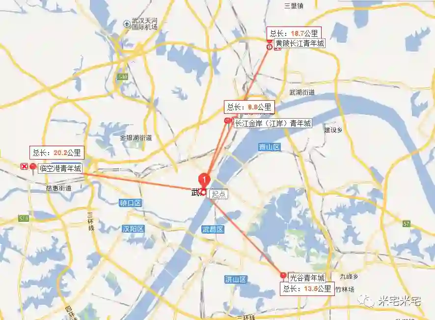 在某APP上搜了一下周边没有二手房,在百度地图上看了一下,临空港青年城四周均为产业园或物流园区,据武汉市政府20.2公里左右,开车时常1小时15分钟。