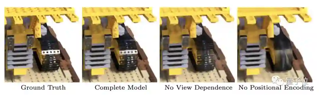 这样做的好处可以通过对比来体现。可以看到,如果去掉视点相关,模型将无法重现镜面反射;如果去掉位置编码,就会极大降低模型对高频几何形状纹理的表现能力,导致渲染出的外观过于平滑。