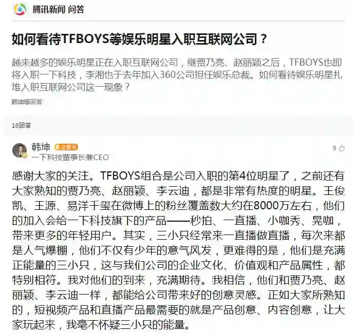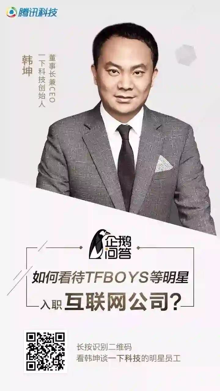 那么,大家对于这么多娱乐明星、大咖纷纷涌入互联网公司,到底是如何看待的呢?企鹅问答平台特别邀请到了一下科技董事长兼CEO韩坤先生来聊聊他的看法。