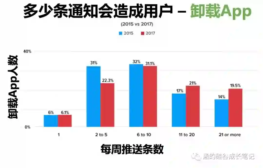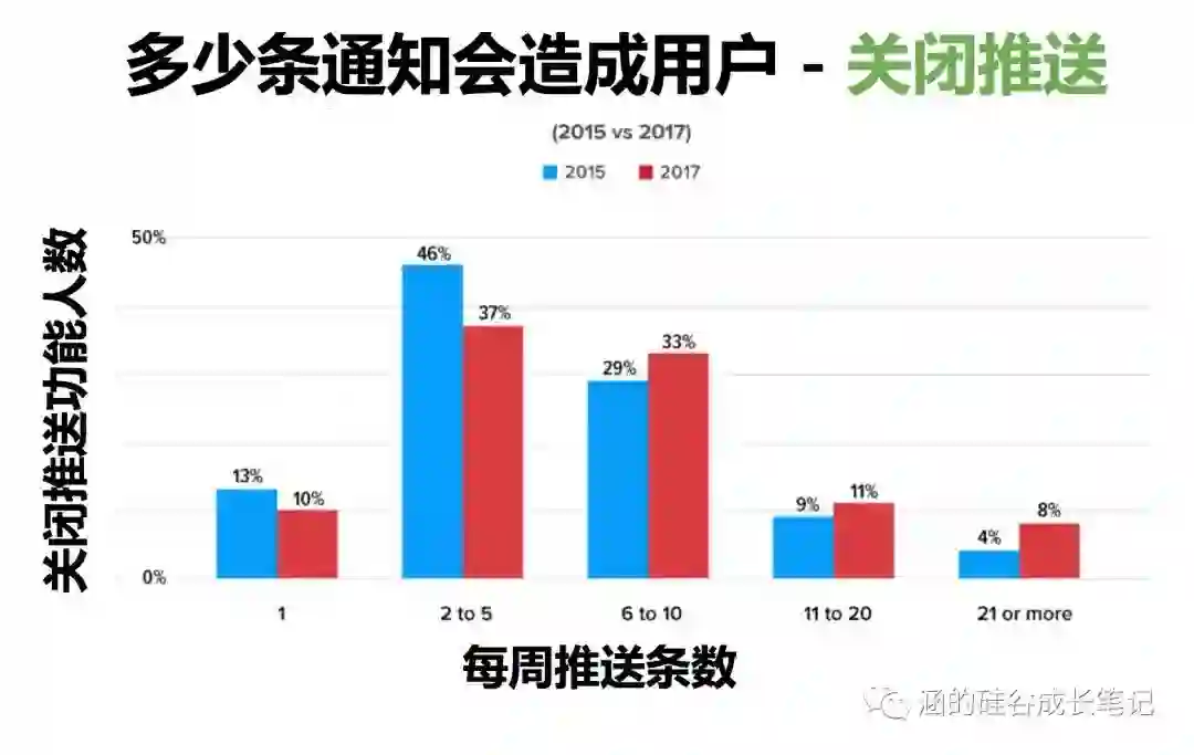 题外话:上面两个统计图,不知道大家还有没有发现:相比两年前的2015年,现在大家对推送的容忍度都普遍提升了!看来小伙伴们在各种App的狂轰乱炸下逐渐弃疗了是么。。。