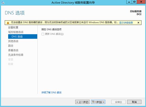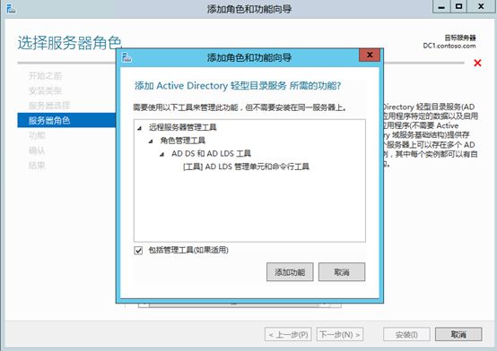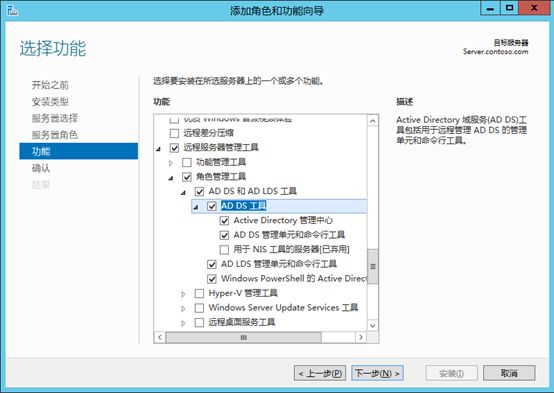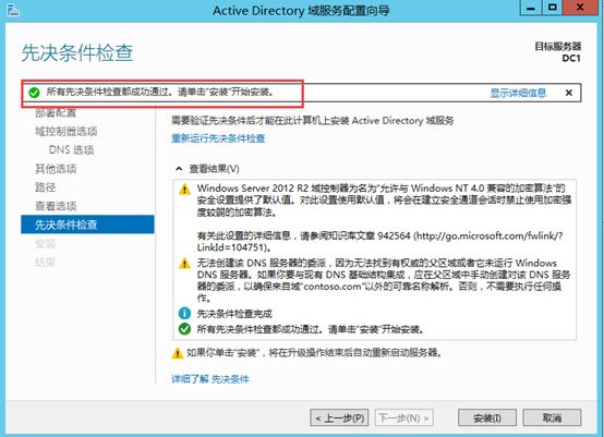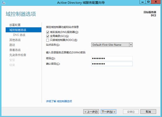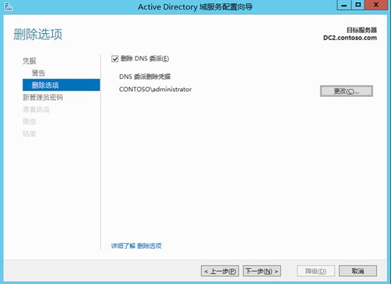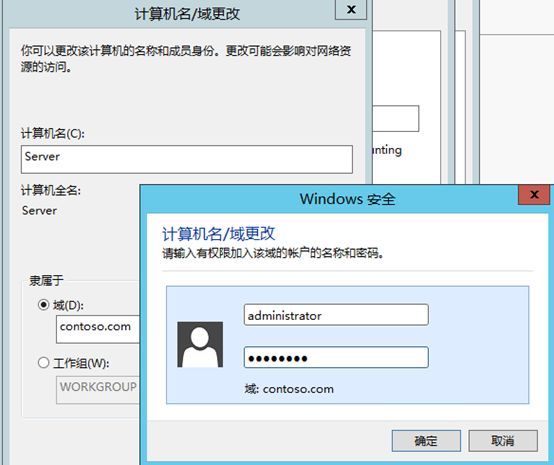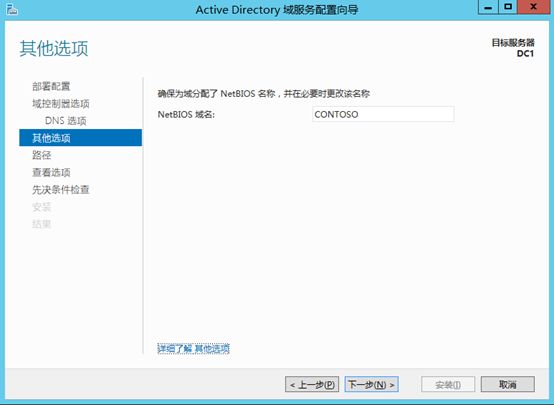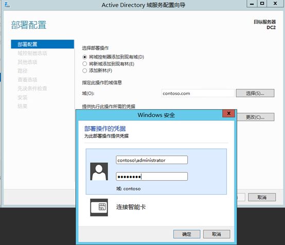 这里不同,将域控添加到现有域,输入域名contoso.com,并且输入现有权限添加域控的账户contoso\administrator的密码。