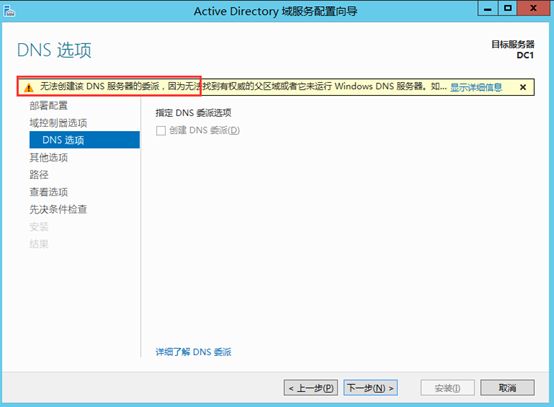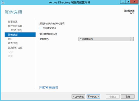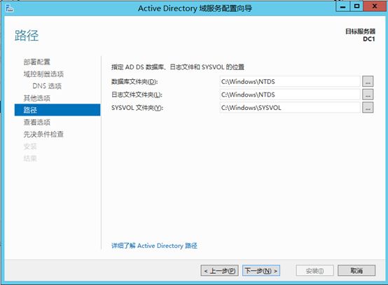 注:AD需要一个SYSVOL文件夹来存储域共享文件(例如域组策略有关的文件),该文件夹必须位于NTFS磁盘,系统默认创建在系统盘,为了性能建议按照到其他分区。