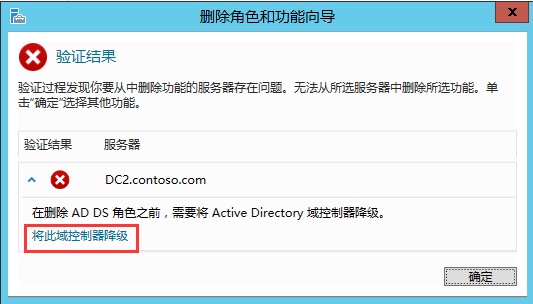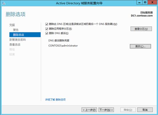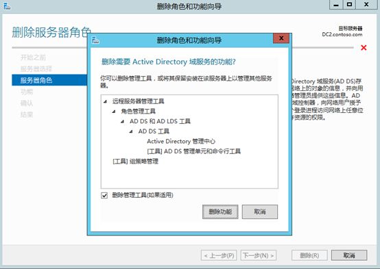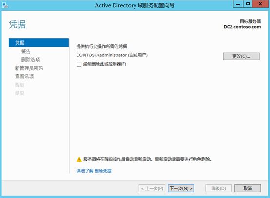 注:建议先将成员服务器server.contoso.com脱离域,因为在域删除后,这台服务器的账户就无法登陆域了(域删除后,也可以再将成员服务器脱离域)。