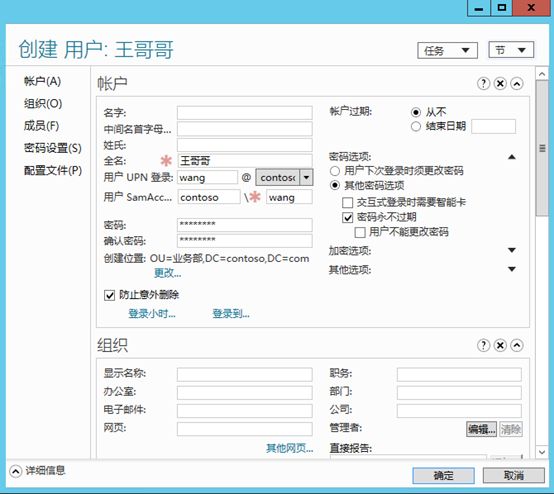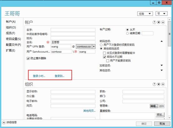 用户名SamAccountName登录:用户也可以利用此名称(contoso\wang)来登录。其中wang是NetBios名。同一个域中此名称必须是唯一的。Windows NT Windows 98等旧版系统不支持UPN,因此在这些计算机上登录时,只能使用此登录名。