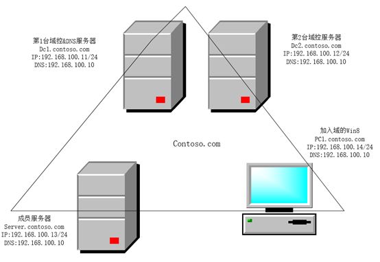 我们按照下图来创建第一个林中的第一个域。创建方法为先安装一台Windows服务器,然后将其升级为域控制器。然后创建第二台域控制器,一台成员服务器与一台加入域的Win8计算机。