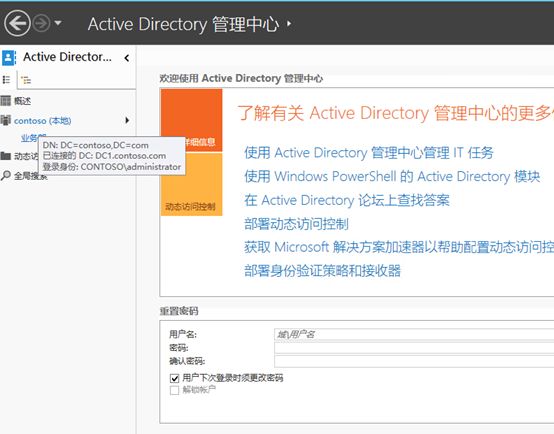 如果要查询目前连接的域控制器,可以如下图在Active Directory管理中心控制台中将鼠标指针对着图中的contoso,他就会显示所连接的域控制器。如果要更改连接其他控制器,单击更改域控制器。