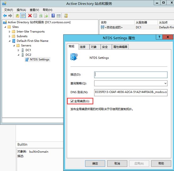如果此域控制器是全局编录服务器,请检查其所在站点内是否还有其他全局编录服务器,如果没有,请先指定另一台域控制器来扮演全局编录服务器,否则将影响用户登录。Active Directory站点和服务-Site- Defalut-First-Site-Name – Server-NTDS Setting并单击鼠标右键-属性-勾选全局编录