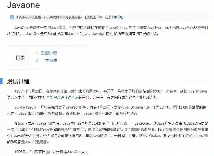 每年一次的Java盛会,当然中国大陆现在也有了JavaChina,中国台湾有JavaTwo,而欧洲的JavaPolis则也是非常的壮观。 JavaOne是在Sun正式发布Java 1.0之后,Java这门新生的语言所拥有的自己的会议。